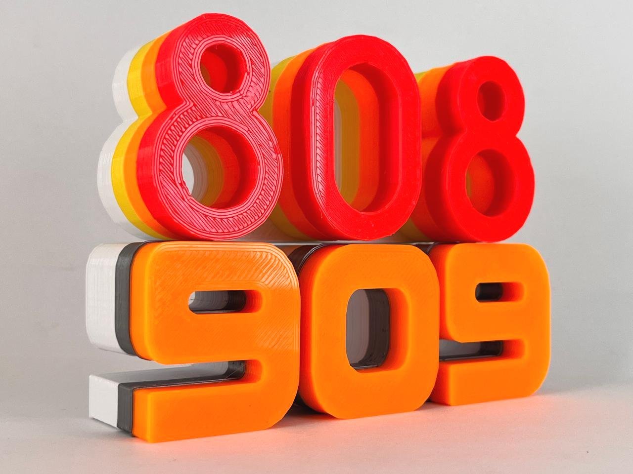 Un adorno impreso en 3D que emula los logotipos de las icónicas Roland TR-808 y TR-909, captura la esencia retro de estas legendarias cajas de ritmos.