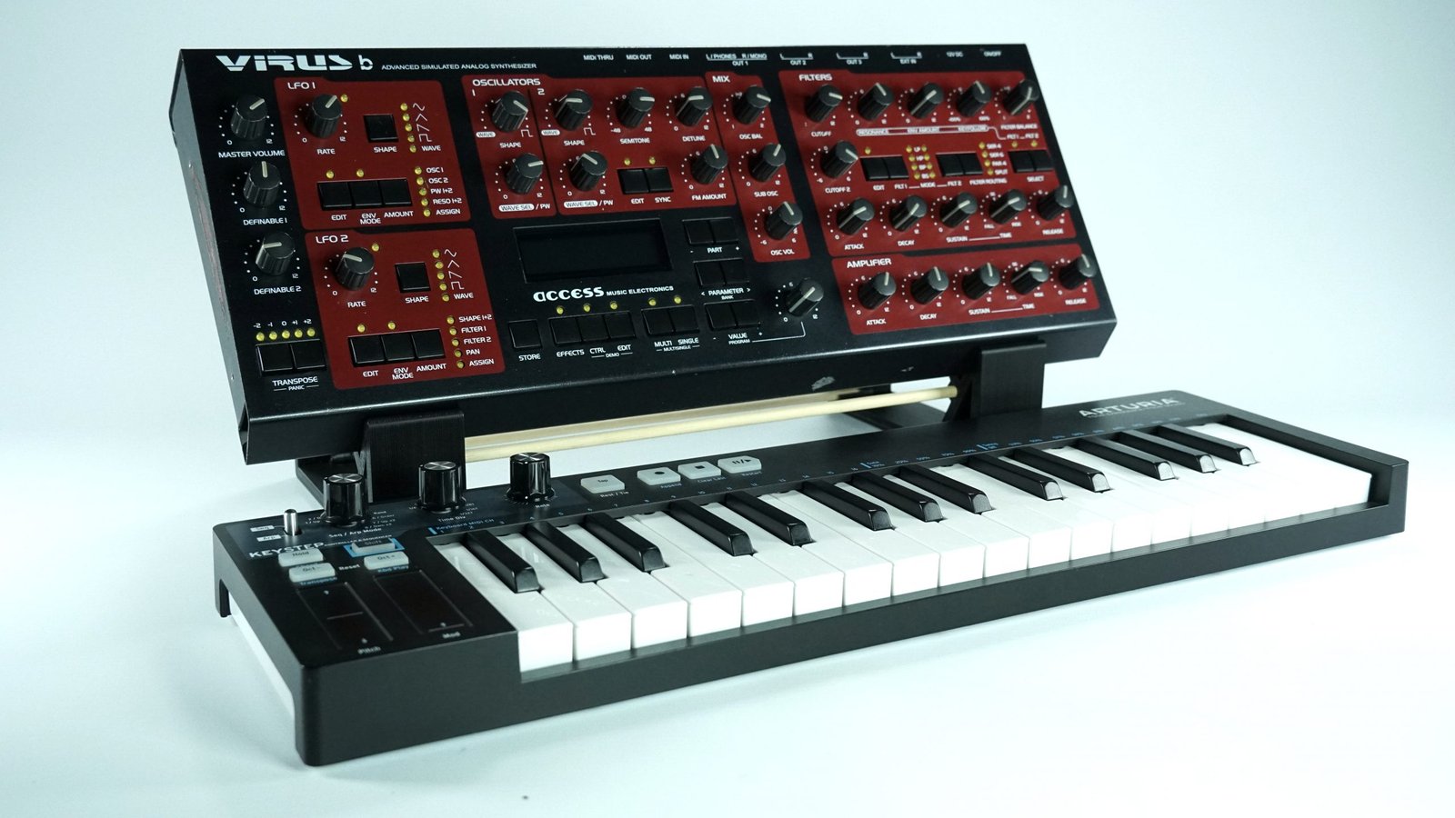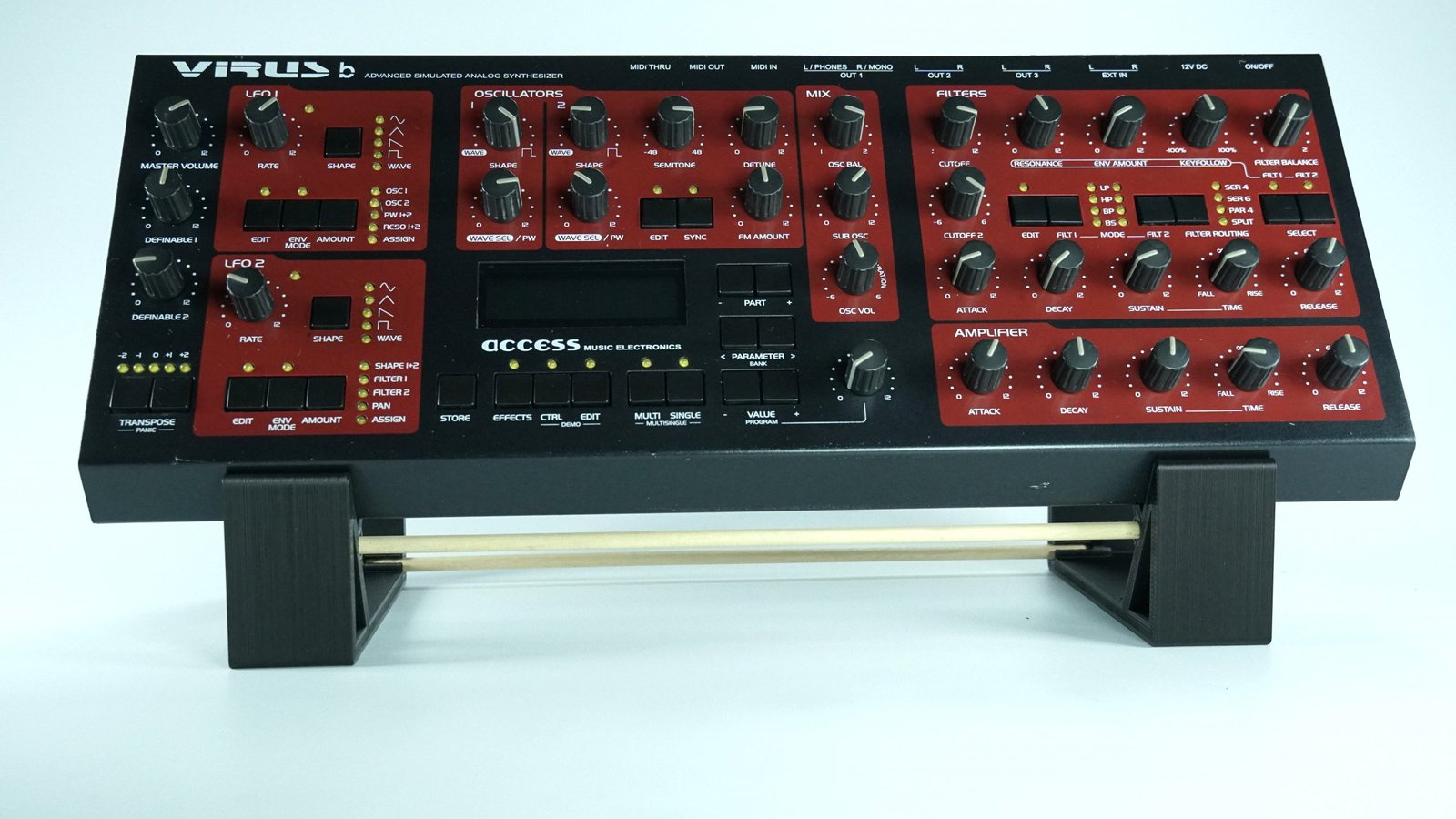 - El diseño incluye áreas específicas de apoyo para cada versión del Access Virus (A, B y C), asegurando que el sintetizador se mantenga de manera estable sin riesgo de deslizamientos.