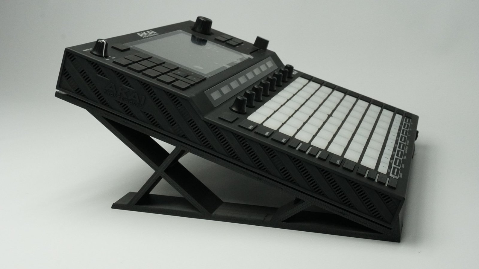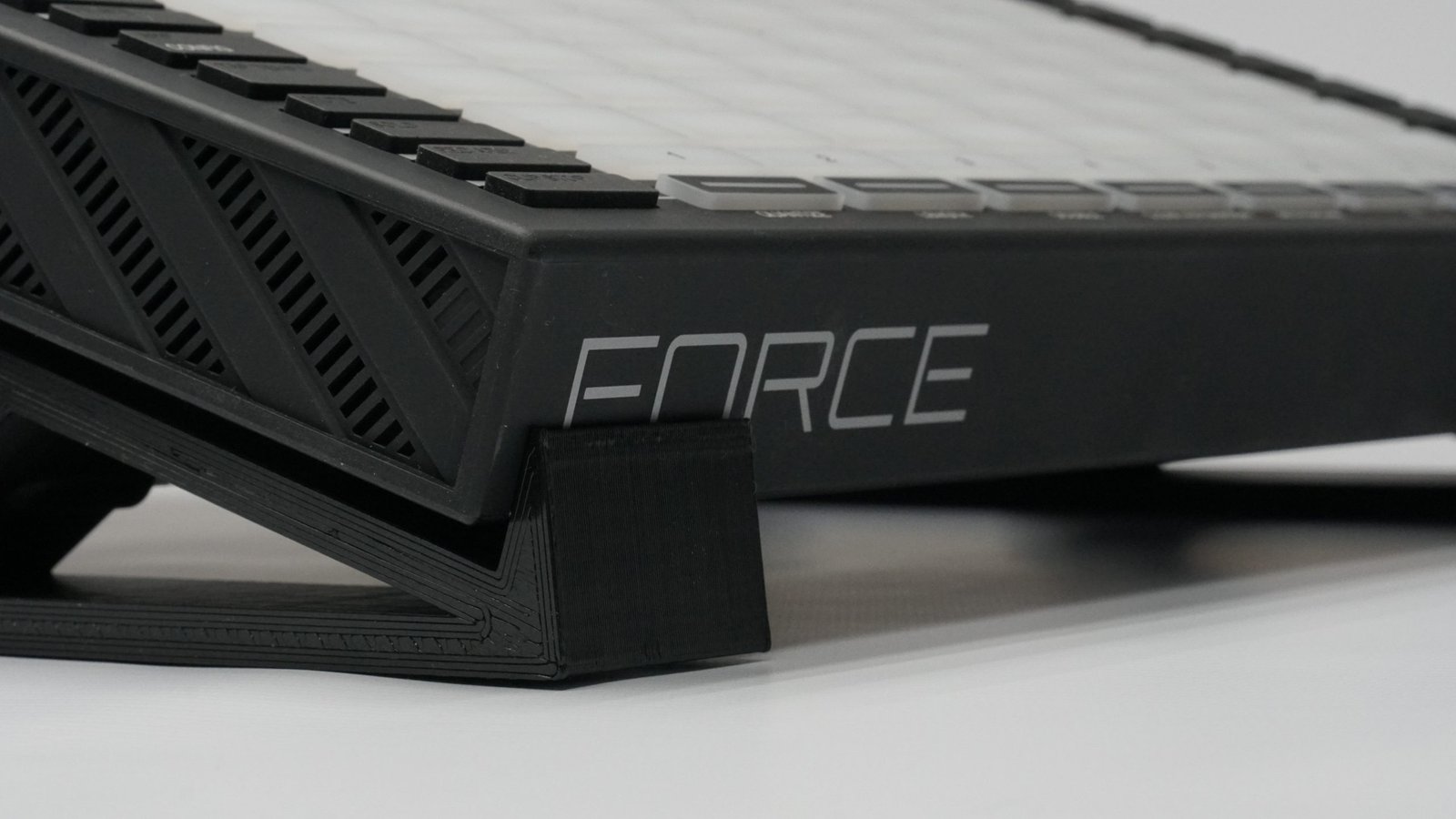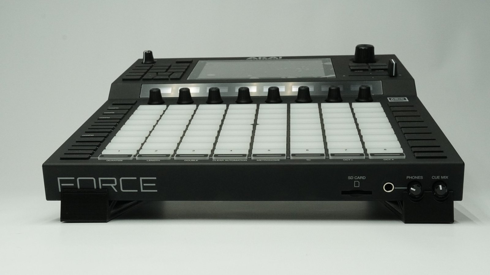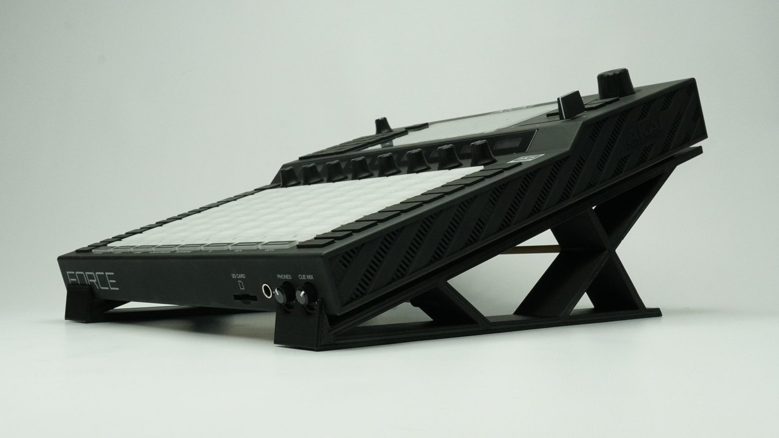 El soporte para Akai Force, tiene un ángulo ideal para usarlo tanto de pie en vivo, como sentado en el estudio.